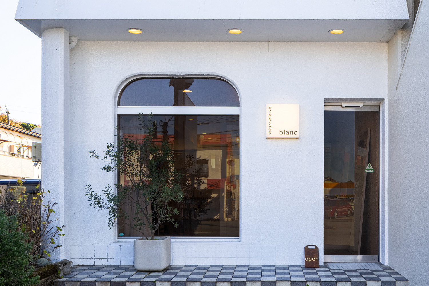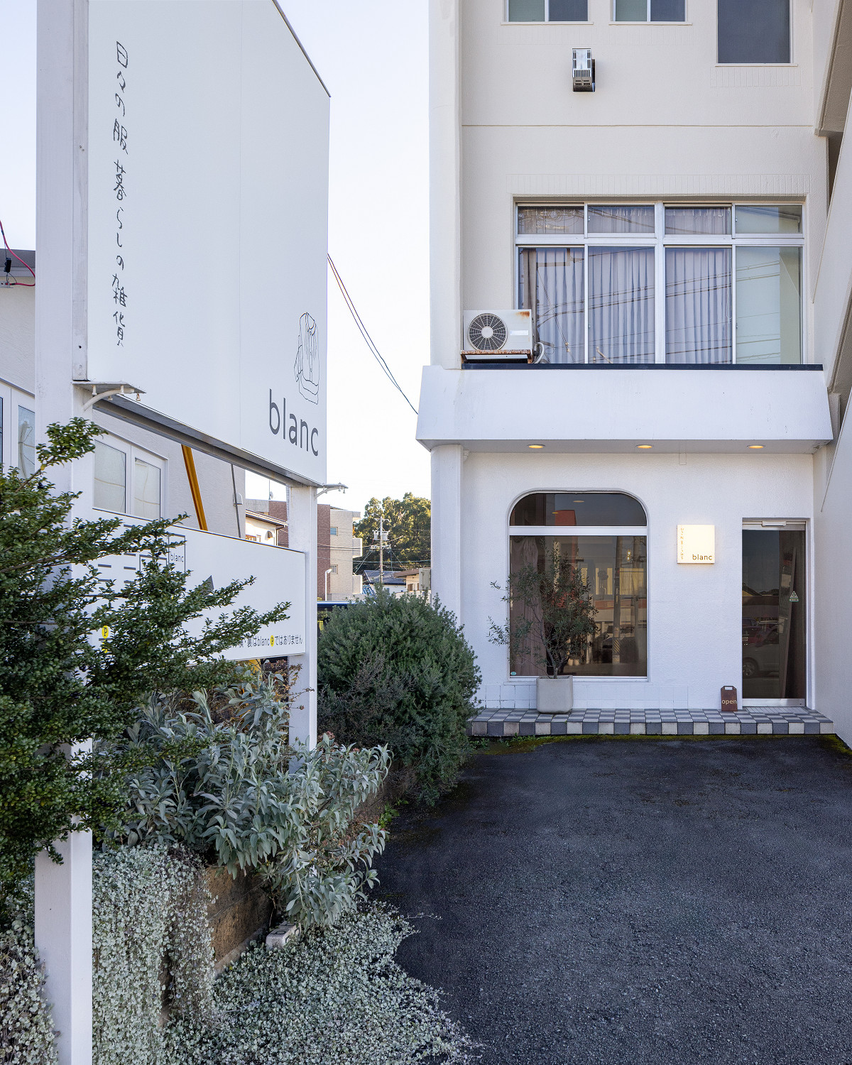 白壁とアール窓が印象的な外観。