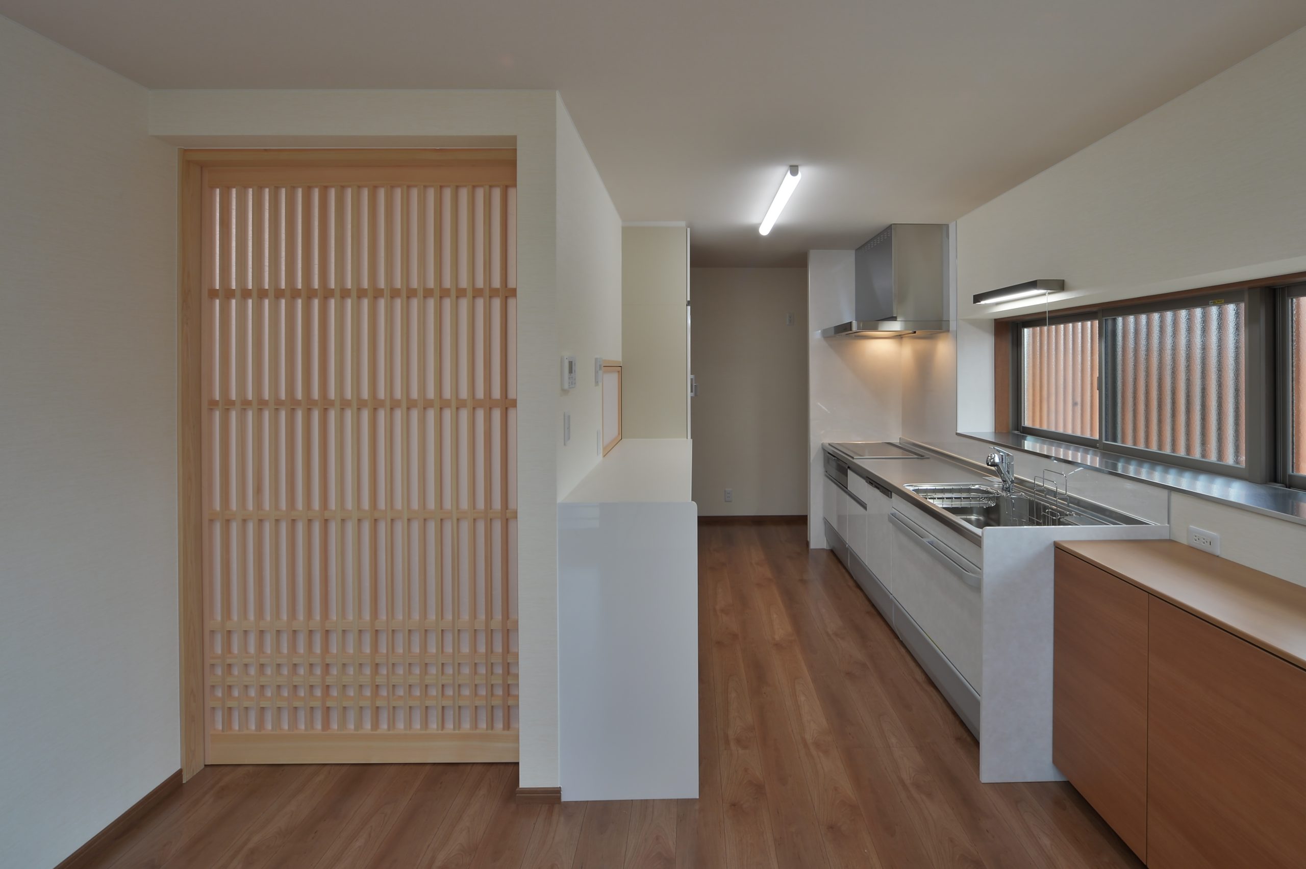 【健康とバリアフリーへの配慮】 外壁から内装まで、地元・松阪産の「杉」を贅沢に使用しました。杉の持つ調湿効果と温かみが、体に優しい健やかな空気環境を作ります。 キッチンや収納などの家具は、既製品ではなく職人による造作です。ご夫婦の使い勝手を一番に考え、何度も打ち合わせを重ねて製作しました。 また、将来車椅子が必要になっても安心して暮らせるよう、玄関アプローチには緩やかなスロープを設け、室内もスムーズな動線を確保。現在の心地よさと、未来への備えが共存する、愛着の湧く住まいとなりました。