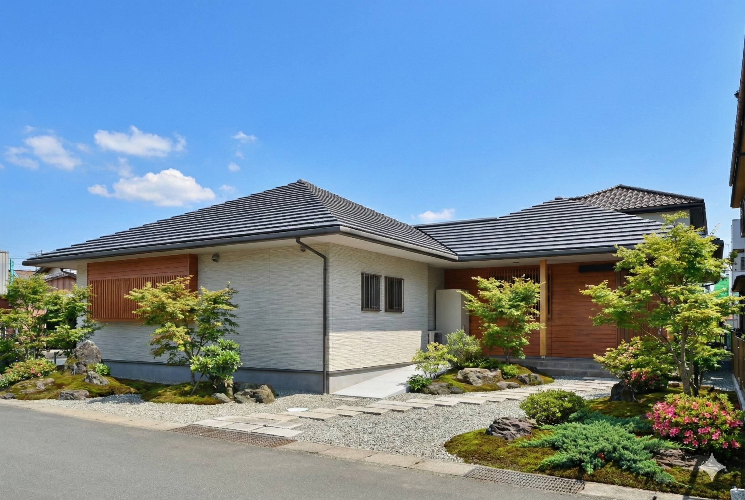 老後の暮らしを見据え、ご夫婦が心穏やかに過ごせる「終の棲家」として計画された30坪の平屋です。 北と東の2面が道路に面する敷地条件に対し、建物を「2つの寄棟屋根」がつながるような形状で計画しました。北東側に駐車場を配することで道路からの視線を遮り、南東側の庭には大きな窓を配置。外からの視線を気にせず、たっぷりの自然光と風を取り込める設計です。街並みに調和しつつ、カーテンを開け放って暮らせる開放感を実現しました。