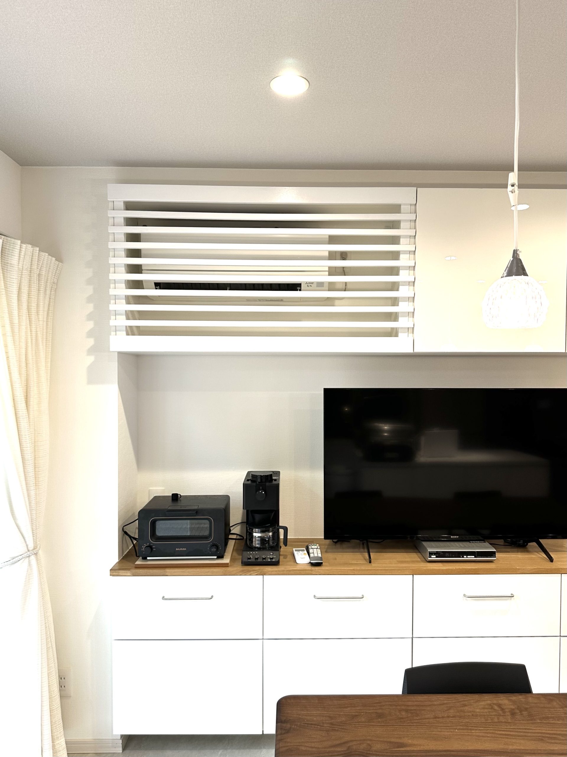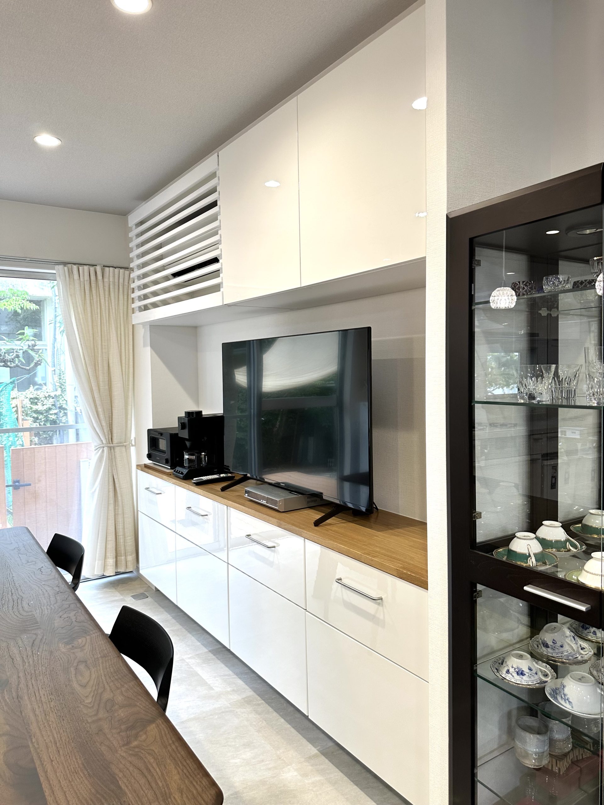 また、テレビ台および背面収納棚にはIKEA製のユニットを採用し、寸法を精査したうえで空間に組み込み、造作家具のように見せる納まりとしています。既製品でありながら、壁面いっぱいに計画することで一体感を持たせ、コストとデザイン性の両立を図りました。
