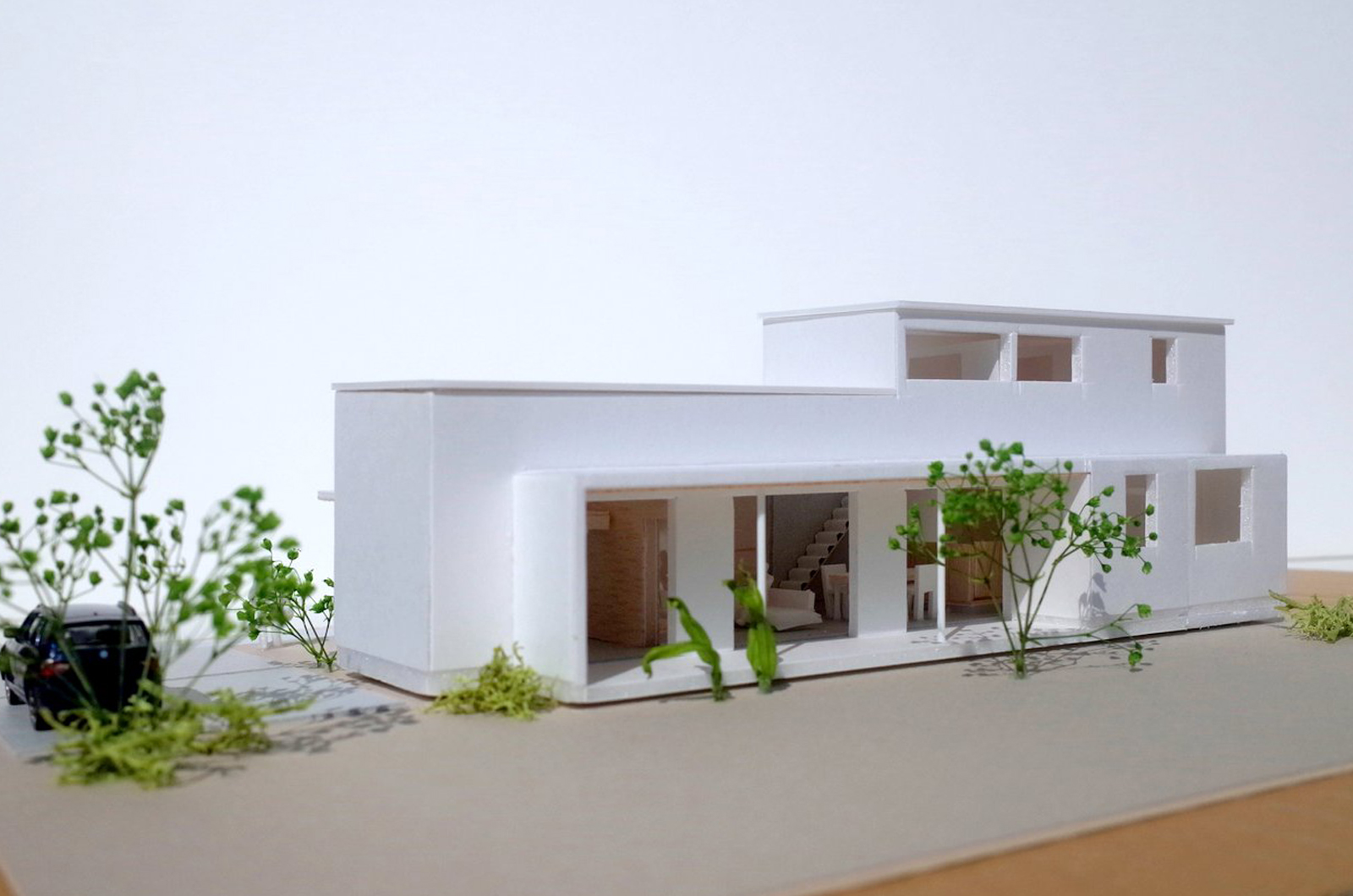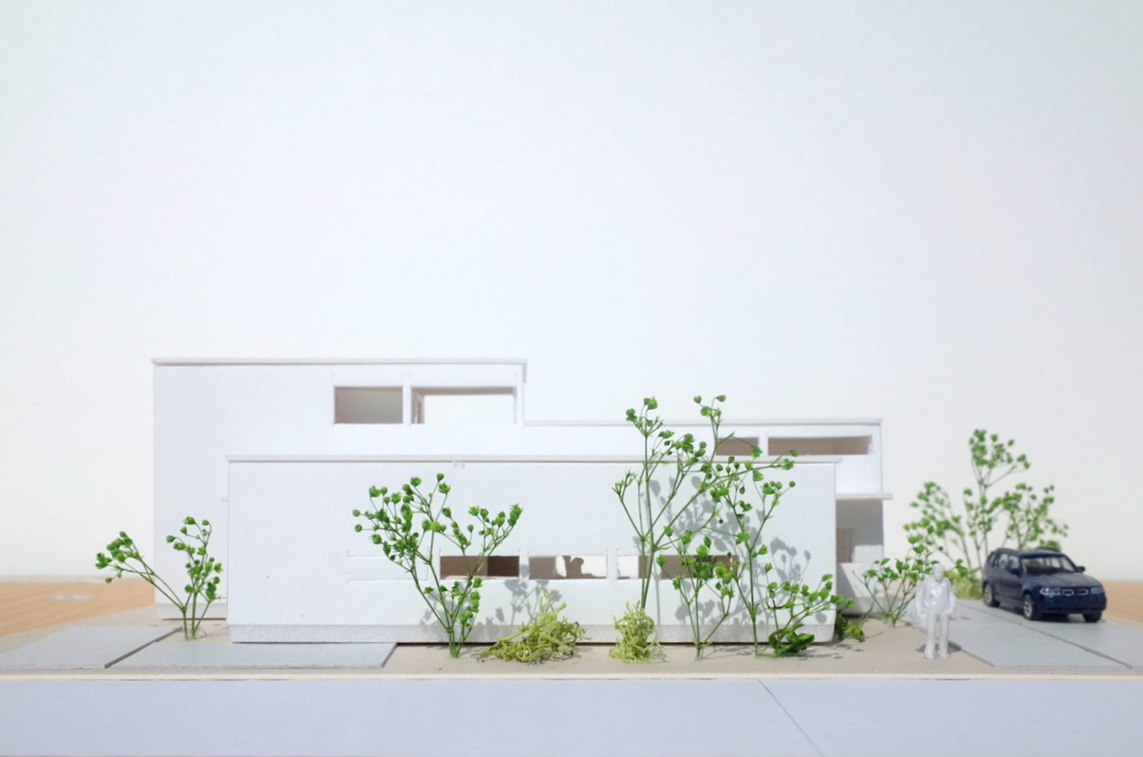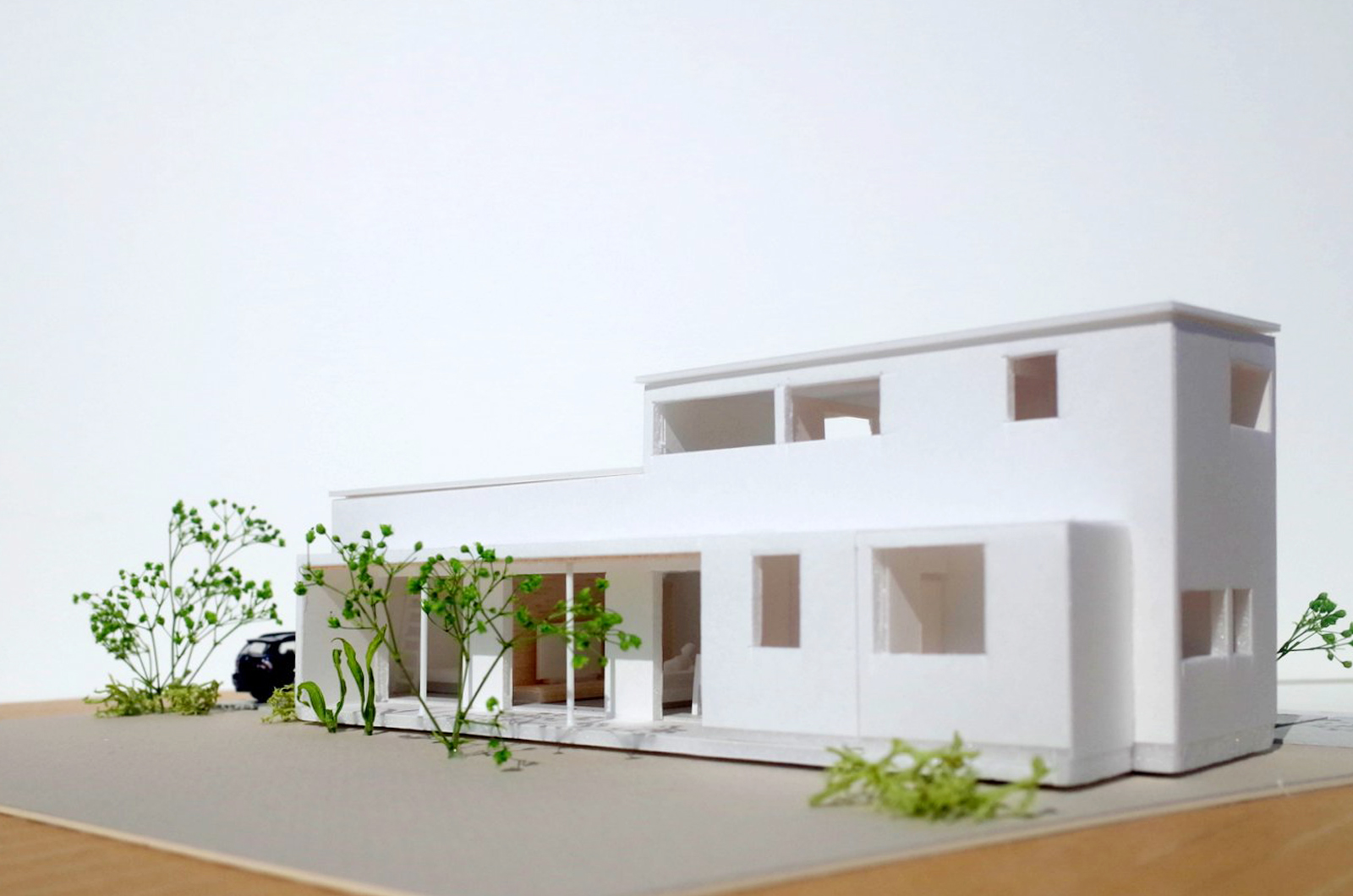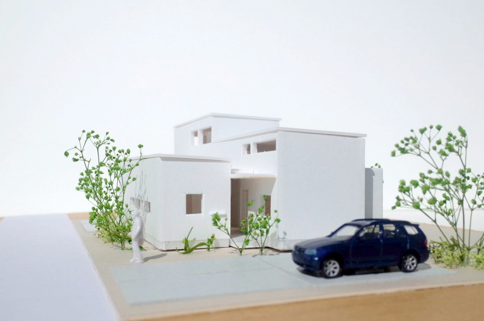 調整区域の敷地へ新築する、期間の長いプロジェクト。いろいろなプランを検討するなか、勾配屋根をゆるくしたボックスプラン。外壁の質感でかなりイメージかわります。室内の吹抜けが時間によって室内に動きを与えるポイントです。