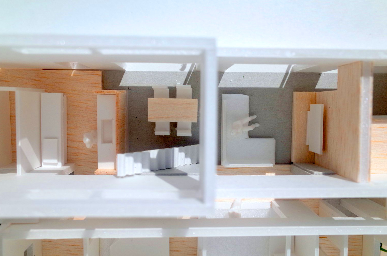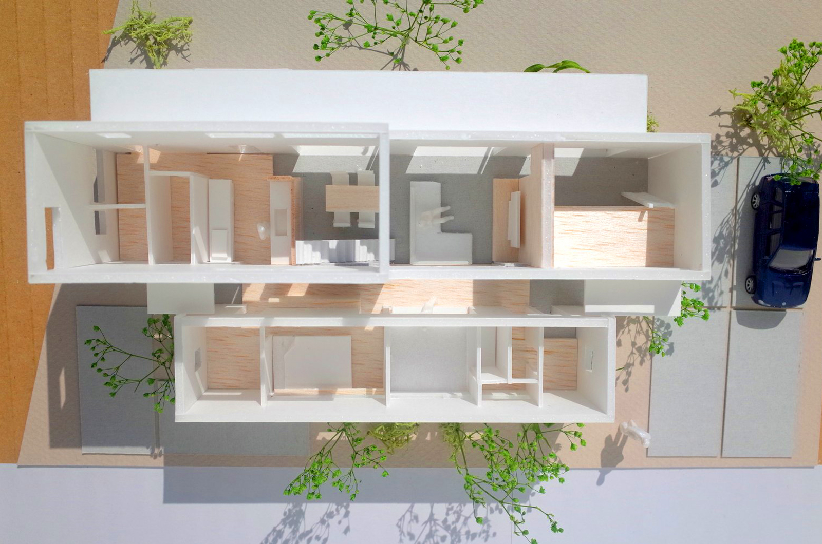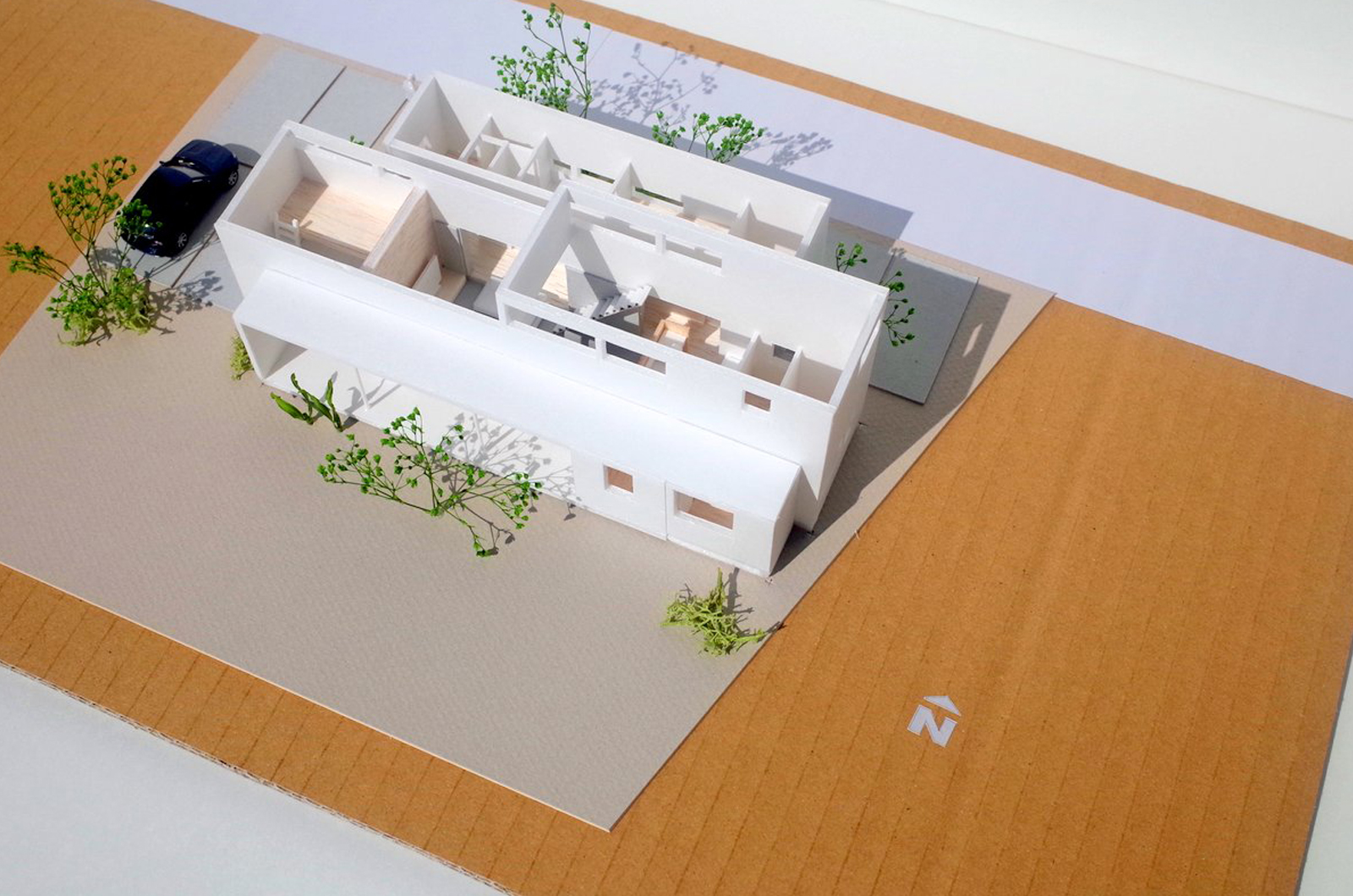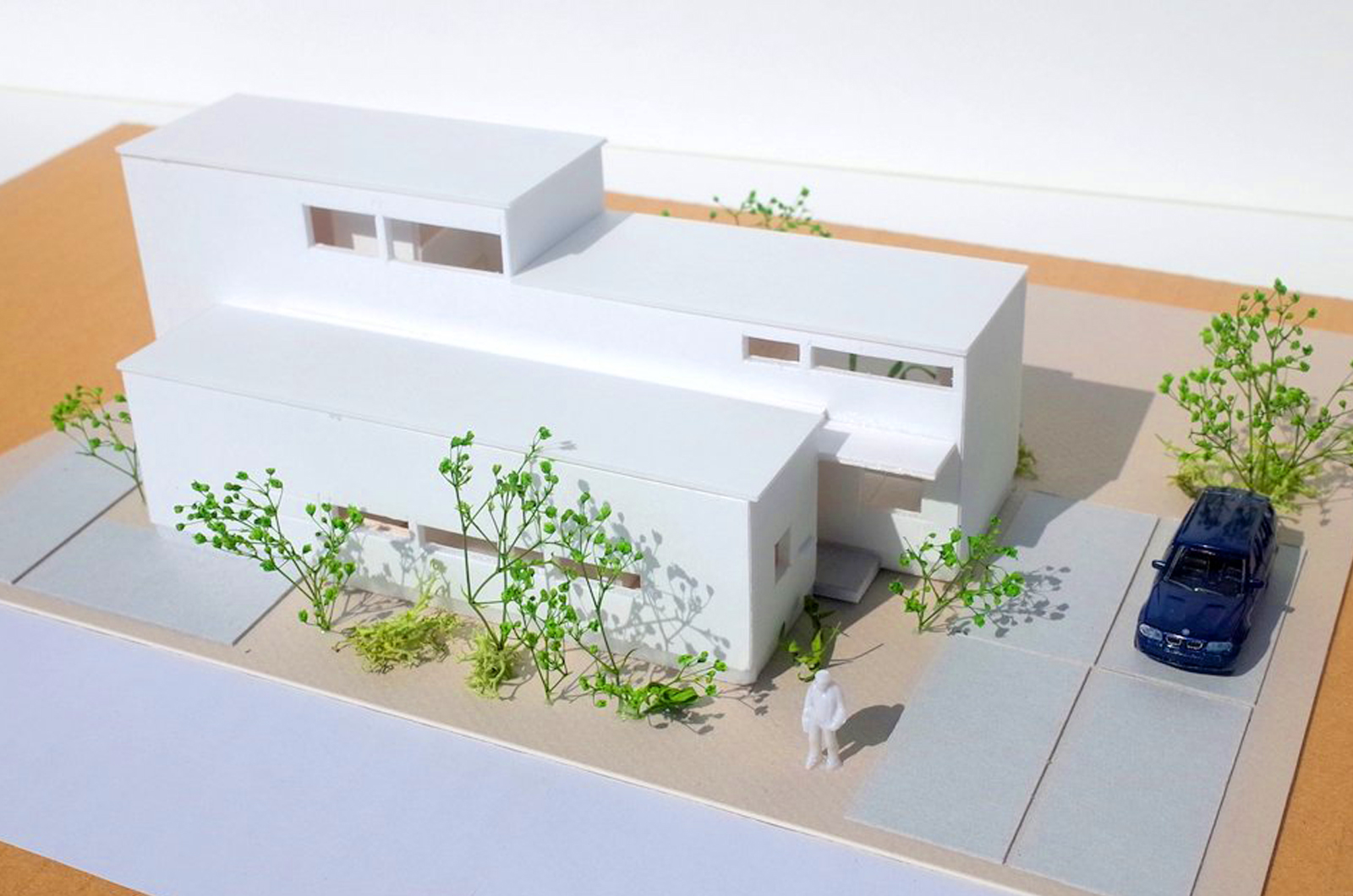 調整区域の敷地へ新築する、期間の長いプロジェクト。いろいろなプランを検討するなか、勾配屋根をゆるくしたボックスプラン。外壁の質感でかなりイメージかわります。室内の吹抜けが時間によって室内に動きを与えるポイントです。