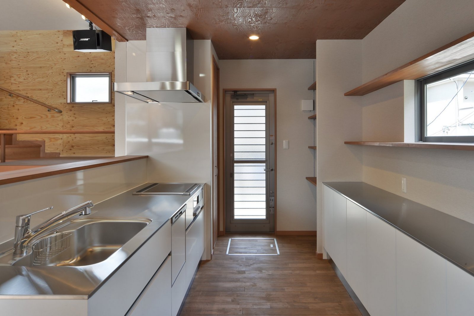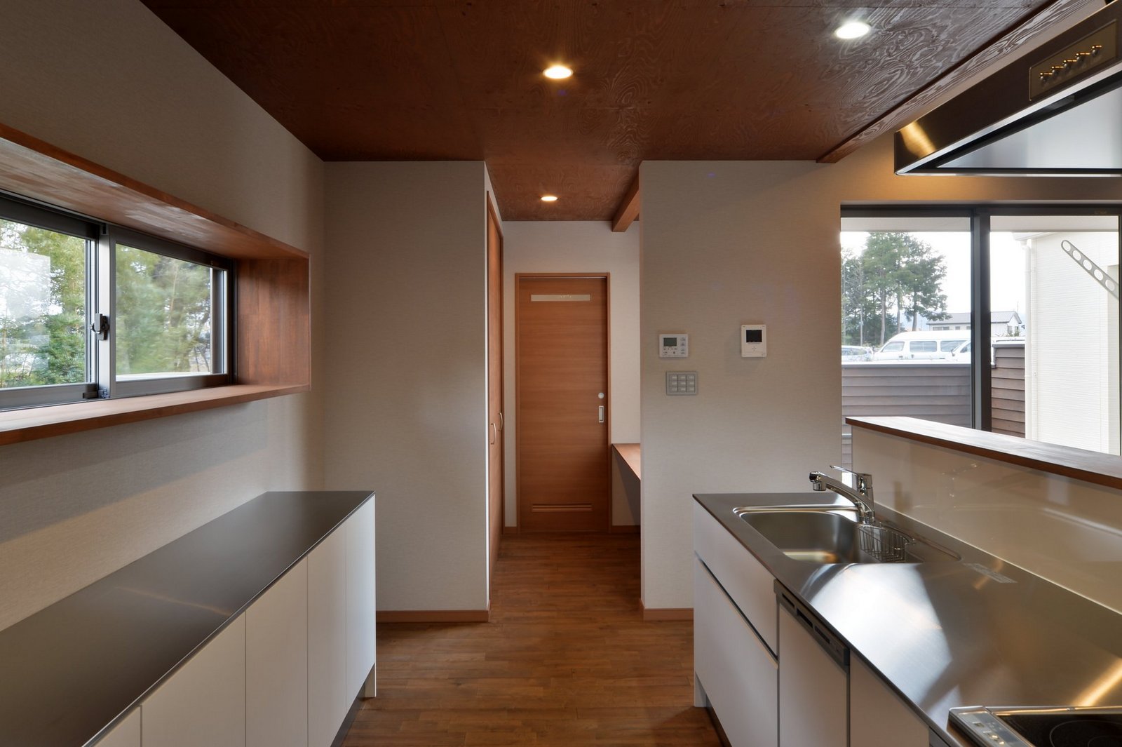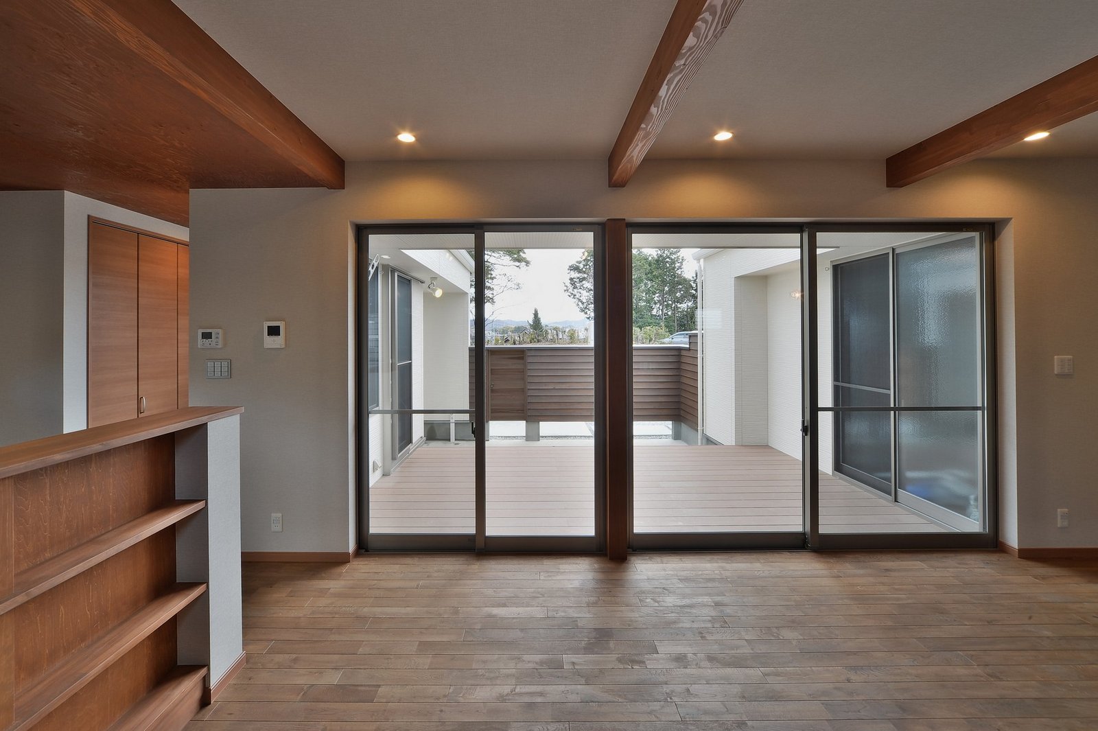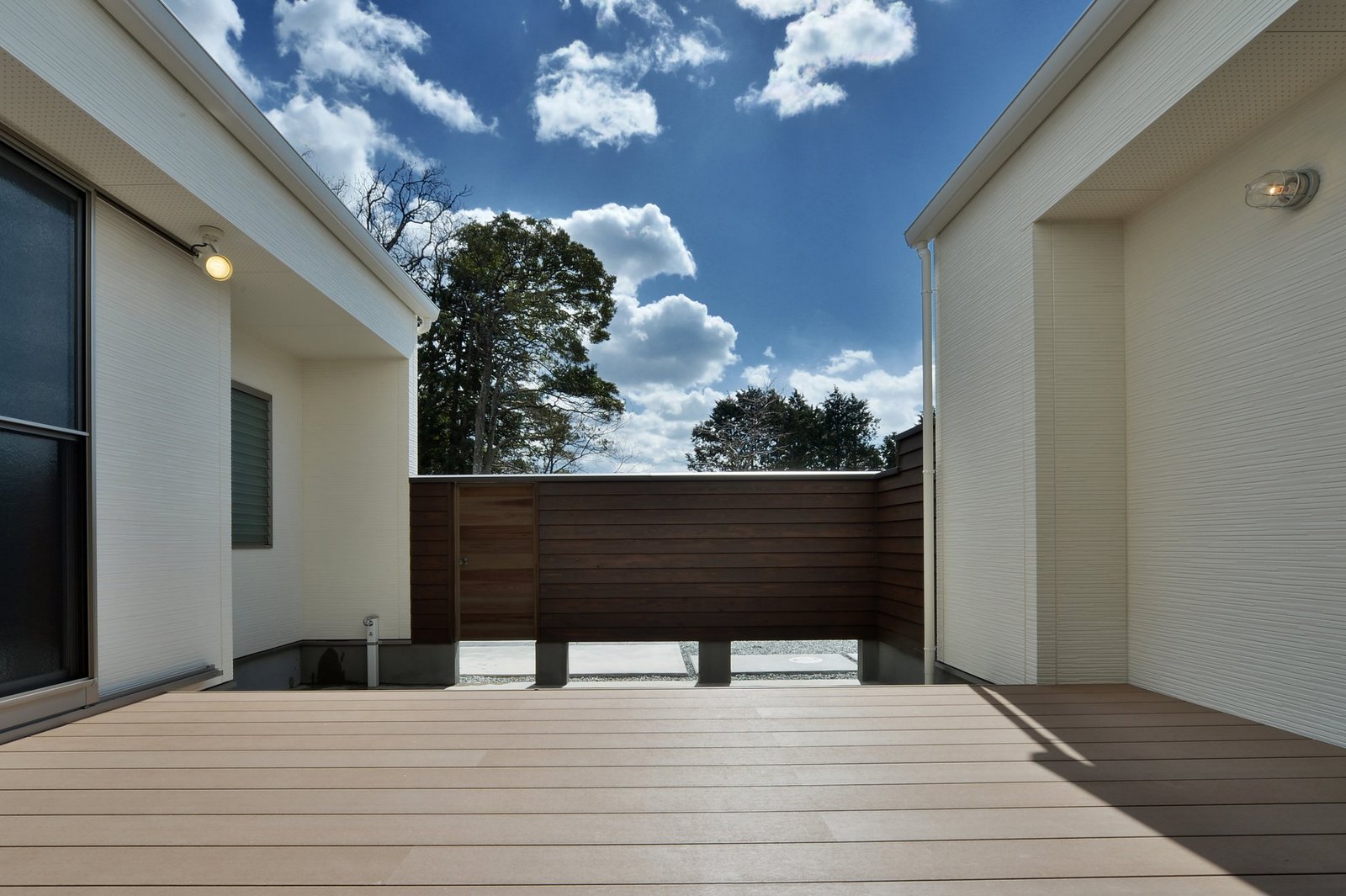 最初に敷地を見に行った時にいいなと思ったのが南側の雑木林でした。クヌギの大木が植わっていて鳥の鳴き声が響いていた。その南側に大きく開いた窓を設けウッドデッキを付けたプランを提示しました。プライバシーと水廻り動線を考えた中庭プランになっております。